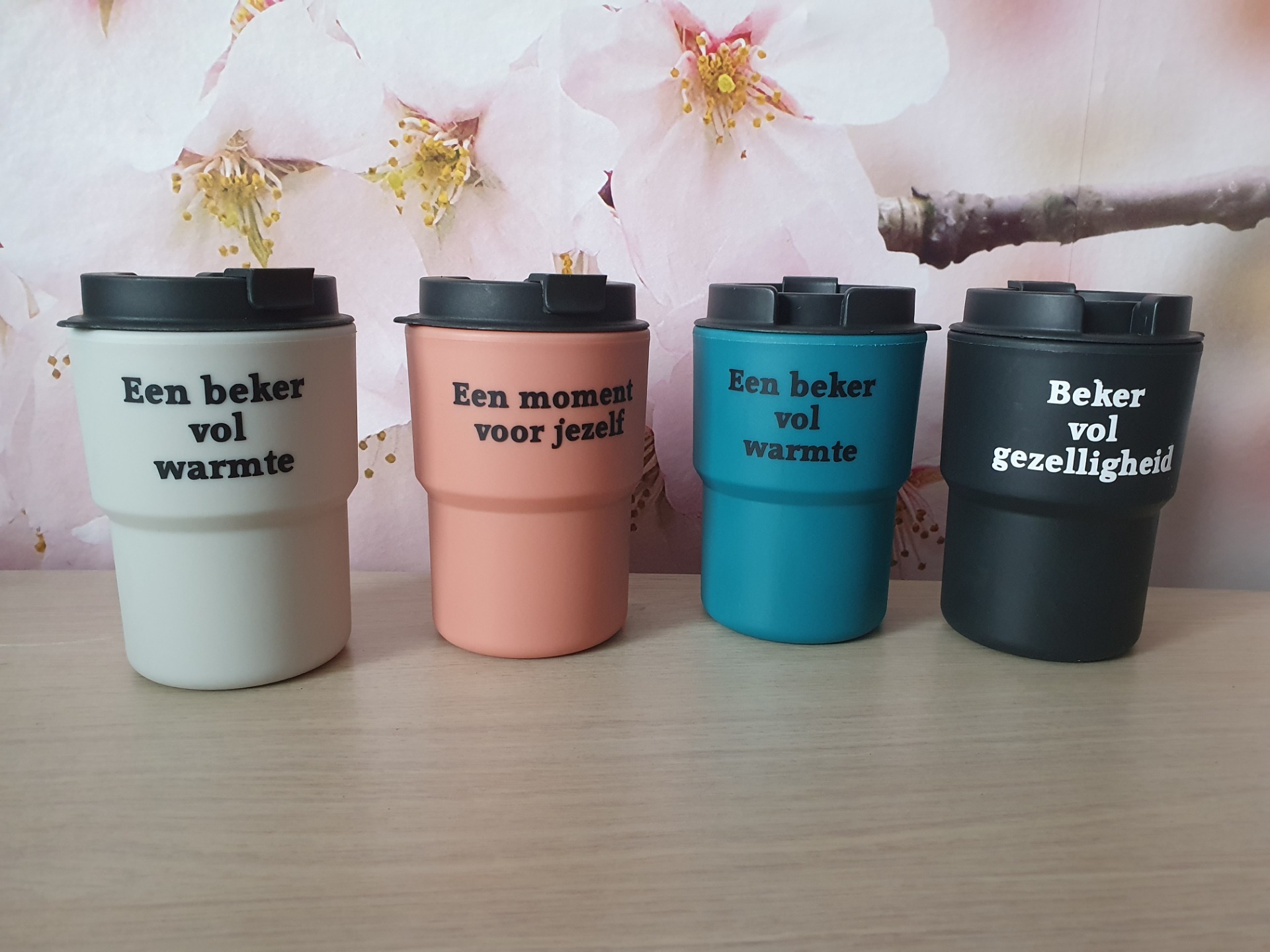 Met deze beker neem je altijd een glimlach en je drankje mee voor onderweg.