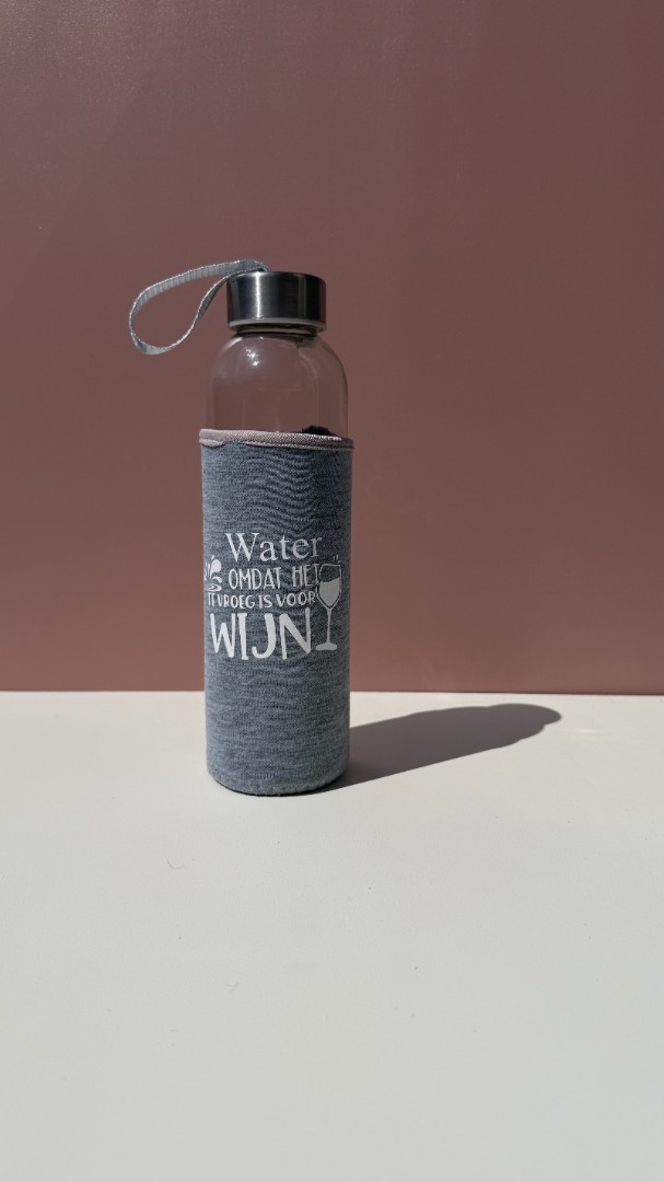 Glazenwaterfles met een grappige tekstopdruk.