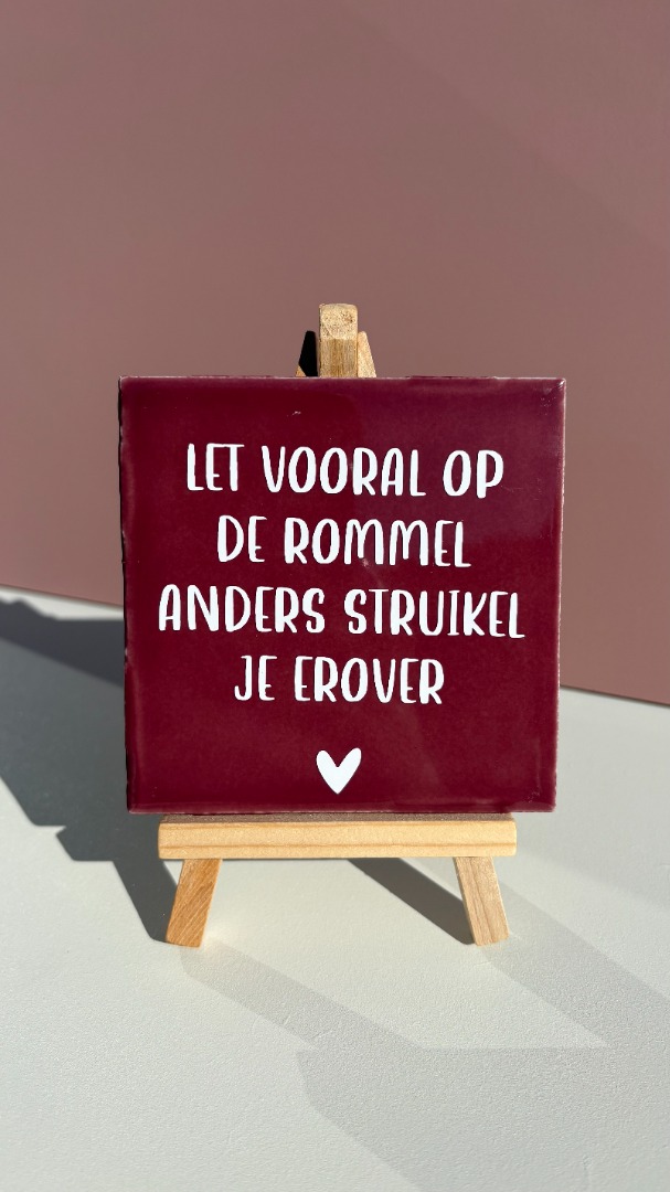 Tegeltje met tekst: Let vooral op de rommel anders struikel je erover.